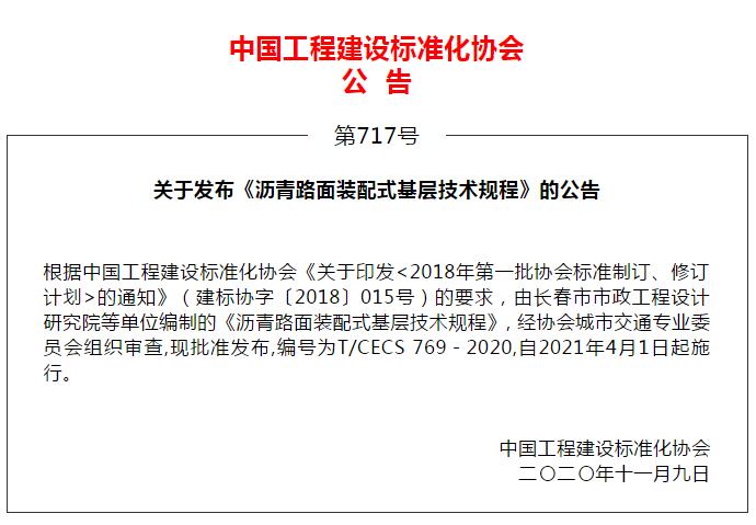 我院主編的中國工程建設標準化協會標準《瀝青路面裝配式基層技術規程》今日發布,2021年4月1日起施行,適用于全國市政道路建設。